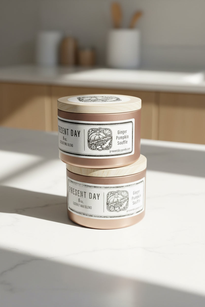 Ginger Pumpkin Soufflé is our cozy, grown-up take on fall’s favorite dessert. Bright, fresh ginger cuts through the sweetness, giving this candle a warm, aromatic lift you won’t find in traditional pumpkin scents. The creamy pumpkin heart blends with vanilla, toasted sugar, and a hint of smoky embers for depth—soft, warm, and quietly addictive.