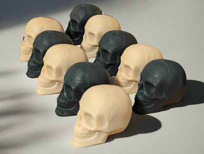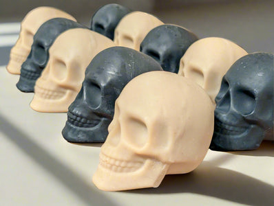 A skull with a softer side. Inspired by pale stone statues weathered with time and the bone-white glow of ancestral altars, this soap carries a quiet strength. It recalls the comforting rituals of remembrance—candles flickering, offerings of sweetness, and the enduring beauty found in simplicity.