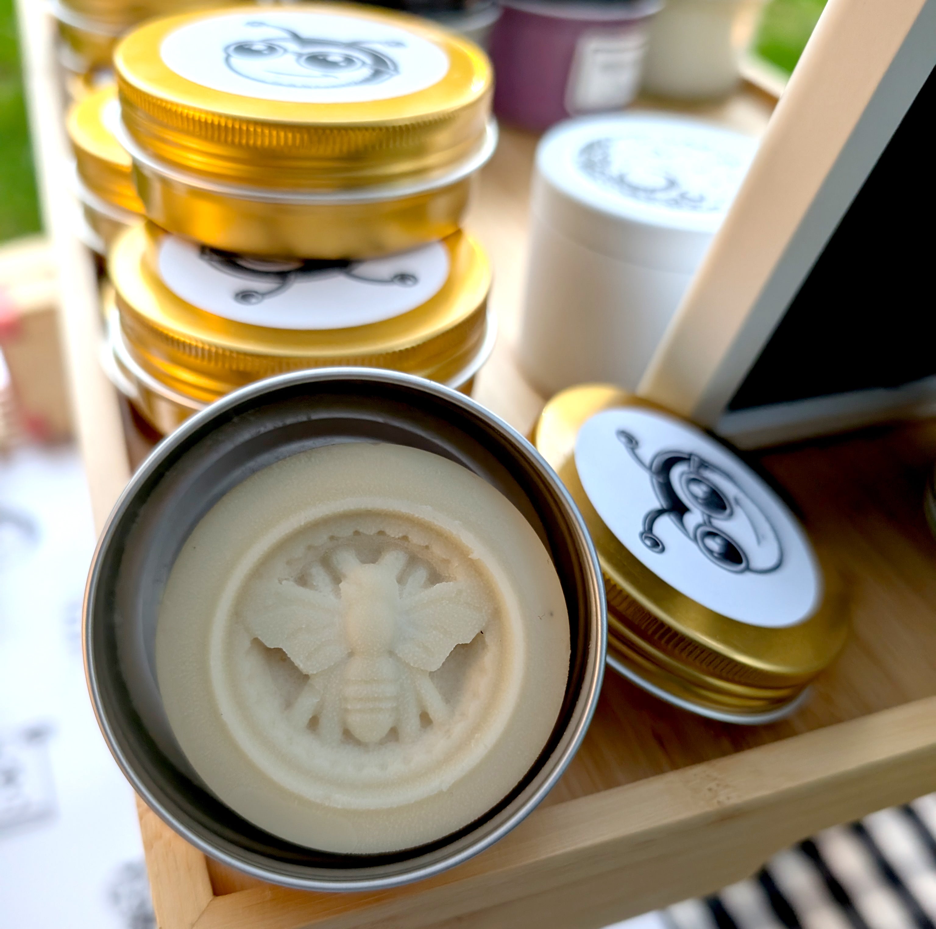 Our boutique, handmade soaps, lip balms and gardeners balms have beeswax and honey from real Jersey City bees. We have seen them IRL.